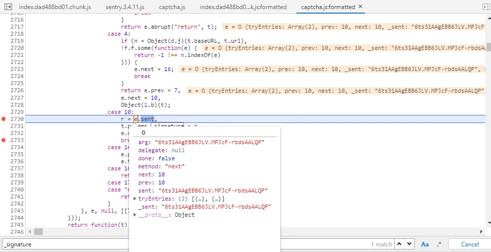 e.next=4条件里随意下断点看看e.sent或者e.arg参数是否有赋值; - 到这一步仍未进行赋值,所以很有可能在