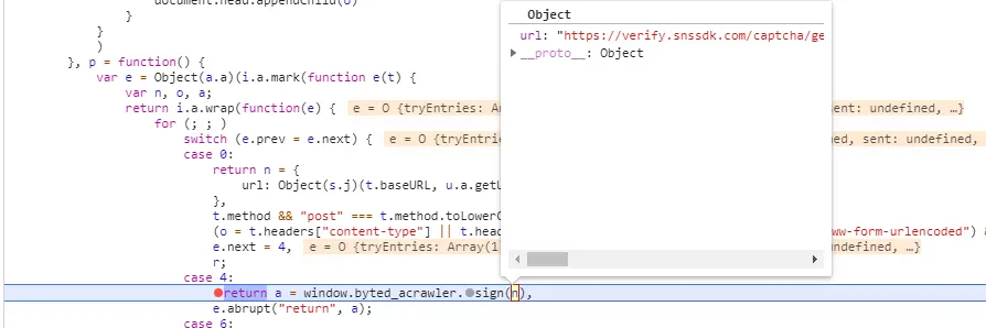 Object(l.b)(t)里会有加密赋值的操作,F9跟进查看,继续是断点一步步调试 window.byted_acrawler.sign这个方法便是我们要找的加密方法