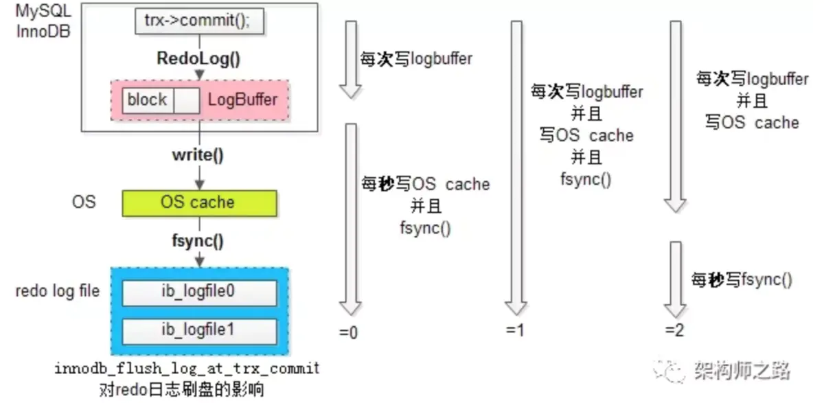 三、为了满足不用业务对于吞吐量与一致性的需求,MySQL事务提交时刷redo log有三种策略: