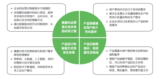 目前制造业的发展趋势,首先要求我们的产品要更加符合用户的个性化的需求。传统的不管是制造业还是零售业,从品牌到最终的用户,中间可能要经过经销商、分销商等等的通道。前端的需求往往不能很及时的反馈到企业。在个性化的要求下,我们需要快速的实现产品的迭代,不仅是产品研发,生产环节也要更加的个性化。其次,就是在产品日趋智能化的背景下,一些行业比如汽车、家具等行业,开始构成了新的生态,比如智能家居、车联网。互联互通会赋予产品新的定义。第三,就是产品的设计和制造的方式会发生很大的变革。随着技术的发展,比如说刚才提到的物联网大数据、人工智能等技术和一些智能设备的发展,会对我们的研发产生很大的变革影响。第四,整个企业的运营都会实时产生一些数据,这些数据,有的会储存在业务系统里面,有些可能就储存在一些离线文档之中。企业运营的过程中需要基于这些数据去做一些核心的洞见,这些数据将会支撑我们的决策。
