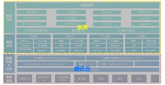 下图是腾讯云联合永洪提供的大数据分析平台的整体技术架构。最底层是基础设施,包括数据的存储以及计算,这个里面涉及到底层的服务器、存储、通信网络。对底层数据进行对接和数据清洗加工后,它们就会被最终整合到我们的数据平台上面来,从而实现子系统的一个互联互通。在底层之上的话,就是基于永洪的产品做出的数据分析和数据挖掘,这可以满足我们做各种各样的机器查询数据报告,包括深入分析的一些数据挖掘和算法。上层就是我们的各个业务主题。