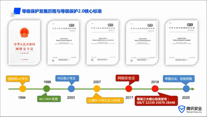 我们经常会听到的一个词是等级保护2.0,那所谓的2.0其实是第二代或者是更新版的一个等级保护的标准。那我们其实讲到等级保护,我们从1994年就可以有这么一个关于等级保护的一个启发的一个状态,就是从国务院147号令里面就规定就计算机的话要划分等级。从中办发的27号文就全面的推行关于等级保护这个建设。然后在06、07年的话也在全国范围内也开展了关于等级保护试点工作的一些内容。