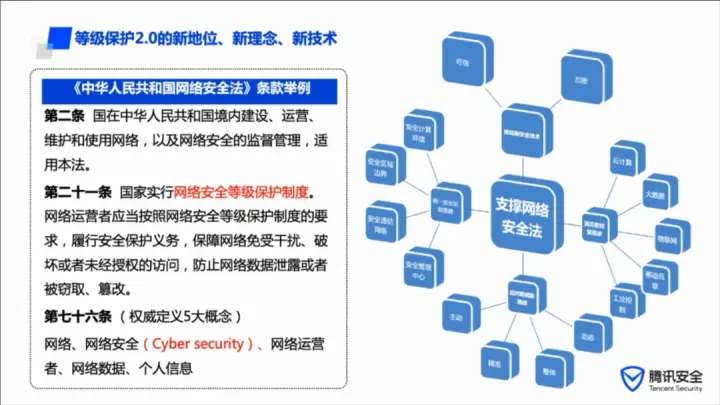 然后我们看等级保护2.0的话其实可以从三个关键词可以去解释。等级保护有了新的地位,因为它获得了法律的支撑在中华人民共和国网络宪法里面就明确的规定了要实行等级保护制度。第二点是等级保护2.0又提出了很多新的理念,包括可信、加密、众生、动态这些相关的一些新的理念。同时又扩展了云计算、互联网、工控、移动互联网等等这些大数据这些新的技术。所以说它有新的地位,它有新的理念,它有新的技术,是符合现在发展的一个潮流的。