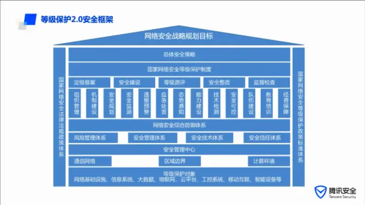我们可以从下图的房子底座开始看,只不过我们新的等级保护二点零保护对象有了明确的变化,以前可能就是一个信息系统,那现在的话是有网络基础设施,也有信用系统、大数据、互联网、云平台、工控移动、互联智能设备等等,都是可以作为一个定级对象的。