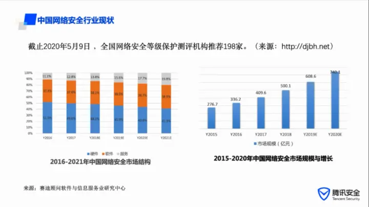 那我们看等级保护这块内容的话,今天看了一下关于等级保护这个测评机构,我们可以看截止到五月九号,全国等级保护测评机构推荐有一百九十八家。这一百九十八家分布在每个省,每个省可能有不同的数量的测评机构。从这个机构我们可以大概的评估一下,如果一家测评机构一年有一千不到两千万这样的规模的话,这个测评这个市场份额其实也是一个不小的数字。可能占比包括咨询、服务、测评这类的话在整个网上市场份额里面可能会达到百分之十到甚至百分之二十这样的规模。