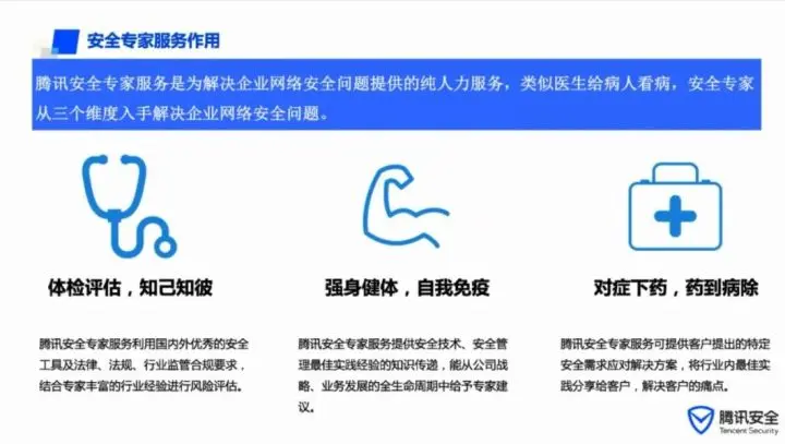 我们现在腾讯提供的一个专家安全方面的服务主要的作用有三块。其实我们可以对比一下就是说我们自身人去看病或者去医院一样,就是我们平常要做体检,那我们专家服务也可以给你的网络、给业务系统做一个体检的工作,做到一个知己知彼的过程。就是我哪里还有不足,哪里还要加强或者哪里做的比较好。然后同时我们也可以专家给你一个建议,指导我们的企业去加强我们安全方面的建设。然后第三点的话就是对症下药,我们出了安全事件以后这边就可以提供专项的溯源和相应的应急响应,这就是完全可以对应起来我们日常的一些评估,然后可以做些免疫的提高以及应急响应的这样的过程。