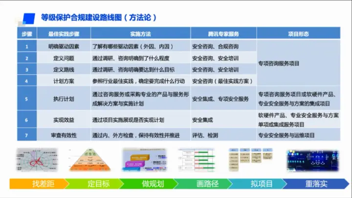 有了这个分析之后我们怎么去做这个解决方案,解决方案我大概分几步去走,解决方案咨询完之后效果也没达到,按照这样的一个闭环去做。那我们可以看到第一步是找一个差距,然后找完差距的话我们要定个目标。那差距的话我们就是以等级保护基本要求控制项做就可以了,然后针对每个领域的内容我们输出一个差距分析结果,每个结果需要去做的一些改进工作我们可以定出目标,每个目标也有不同的方向、不同的阶段,就可以做一个路线图,就是我大概在什么时间做什么样事情,然后以项目的方式落地,以项目做完之后的话我怎么去去那个验证有没有达到效果。以这样一个方法论拿来作为我们等级保护合规建设的一个路线图。然后我们可以用到企业里面、事业单位里面关于安全方面的建设,不光是等保,我们其他的一些安全标准或者行业标准建设都可以采用这样的方式去做。那我们腾讯专家服务也可以辅导我们的客户去做这样的一个咨询、这样的培训以及帮着用户一起来做最佳的实践的方案、落地以及我们一些专项能力的建设。
