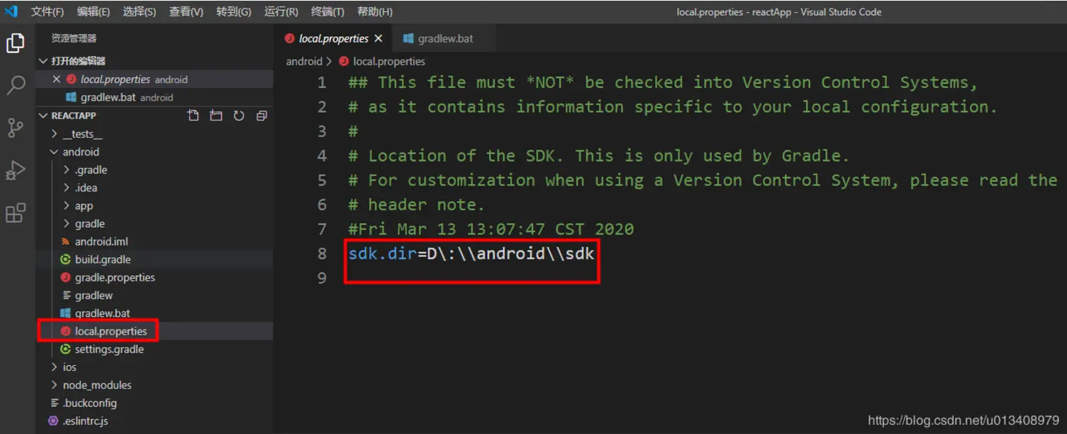 1、把创建好react native项目,使用VS code打开,在android文件下的local.properties写上sdk的路径