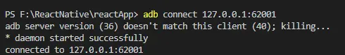 3、输入adb connect 127.0.0.1:62001 连接夜神模拟器,运行后以下日志表示模拟器连接成功