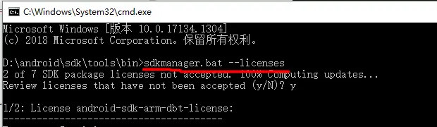 解决方法: 找到SDK目录tools/bin下,在cmd窗口输入sdkmanager.bat --licenses命令,下面提示全部选择y即同意即可 这表示同意sdk所有证书许可授权