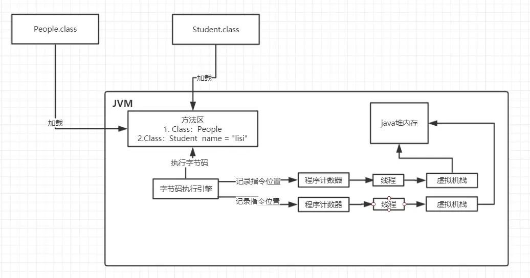 class文件会被加载到方法区中,字节码执行引擎会执行方法区中的内容,程序计数器会记录执行的位置,经过虚拟机栈进入堆内存