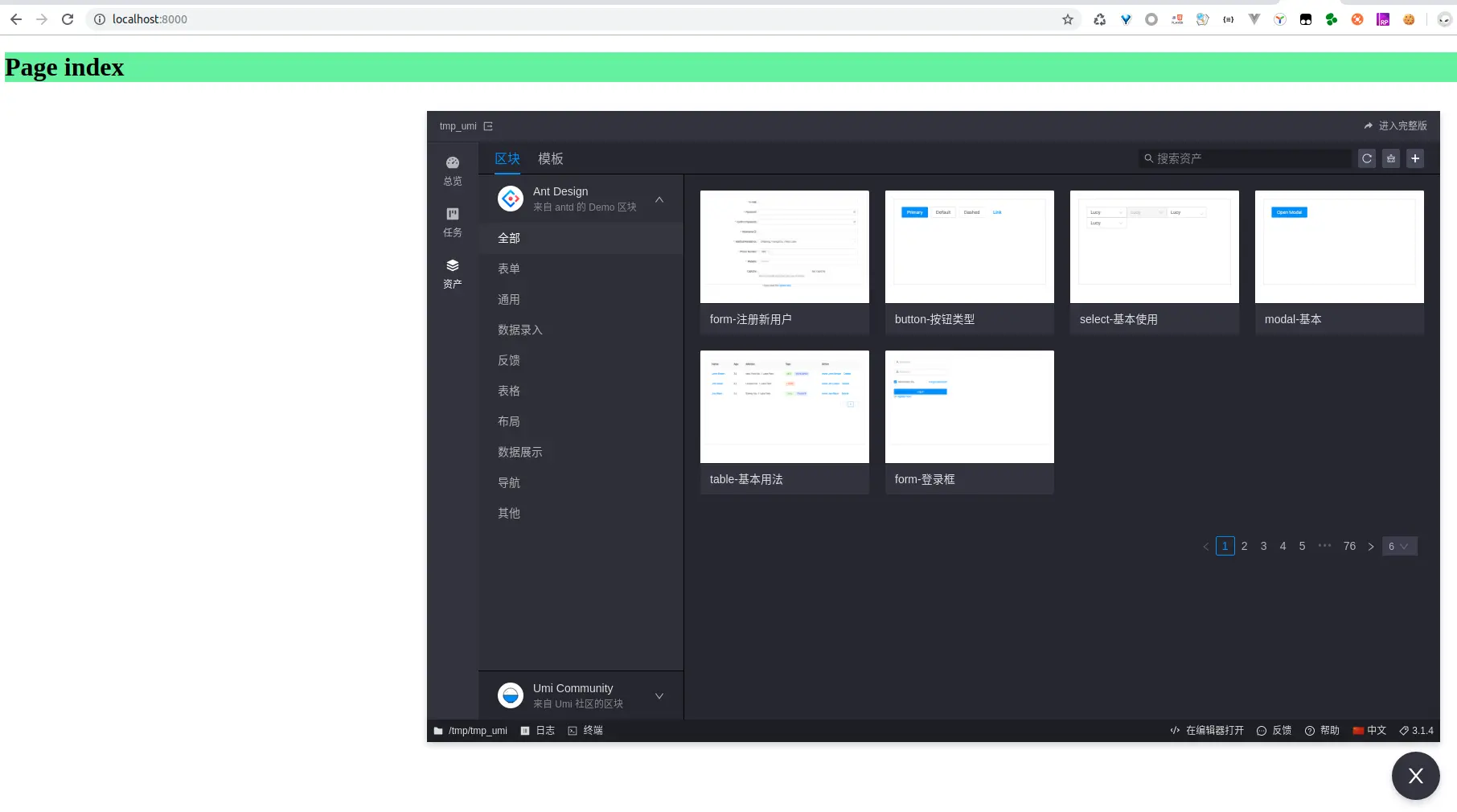 再次启动项目即可看到网页右下角出现一个图标,点开即可开始探索 Umi UI。