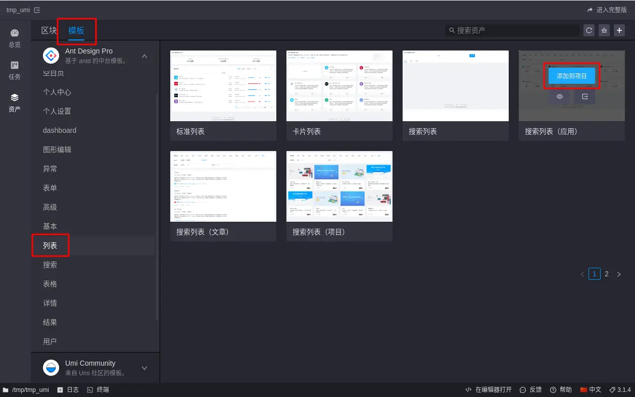 Umi UI 支持在网页上为应用添加现成的模版、启停前端服务等功能。