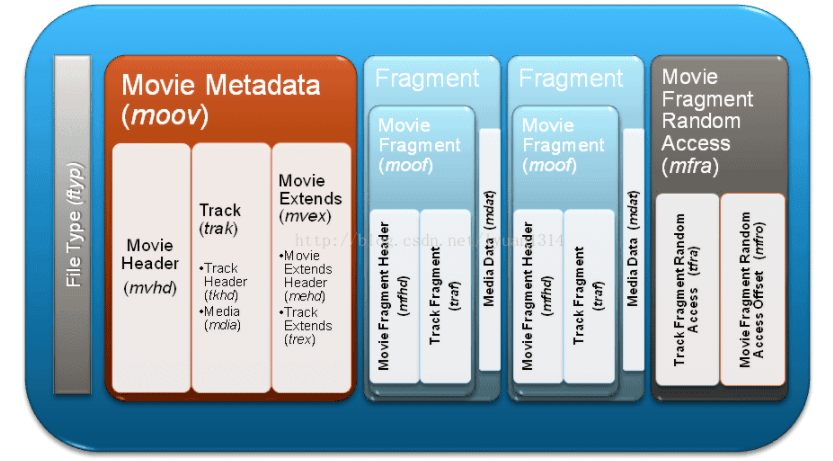 其中FMP4封装格式是HTML5的Media Source Extensions支持的封装格式,像B站的flv.js项目核心就是将FLV文件流转封装为FMP4片段,然后通过该接口送给浏览器进行解码播放,同时FMP4也是DASH协议的媒体文件封装格式,它和MP4封装格式非常类似,其实就是把大的MP4文件进行切片,每个切片都有它自己的meta数据,这样就可以单独播放并且特别适合网络渐进式传输和渐进式播放,同时也方便支持Trick-Play播放。大体结构示意图如下: