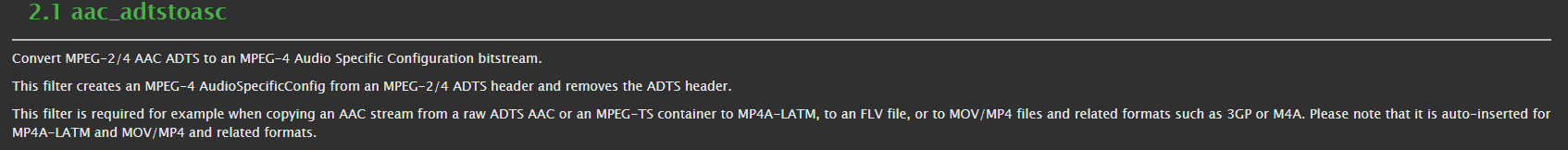 由于我们采用了FFmpeg进行打包和封装MPEG-TS和FMP4片段,则借助FFMPEG的Bitstream Filters即BSF机制即可。