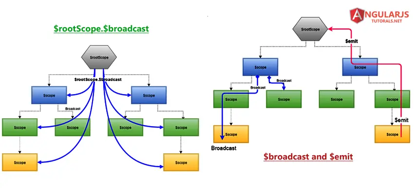 首先 AngularJS(AngularJS 代指 1.x 版本,Angular 代指 2 以及之后的版本) 框架中也支持全局的事件机制,比如 $broadcast,$emit 等等。这样的事件机制支持变化从 $rootScope 向各个 contoller 的 $scope 广播全局的变化。如果你对 scope 这个概念不熟悉的话,可以把它理解为模块内部的作用域。