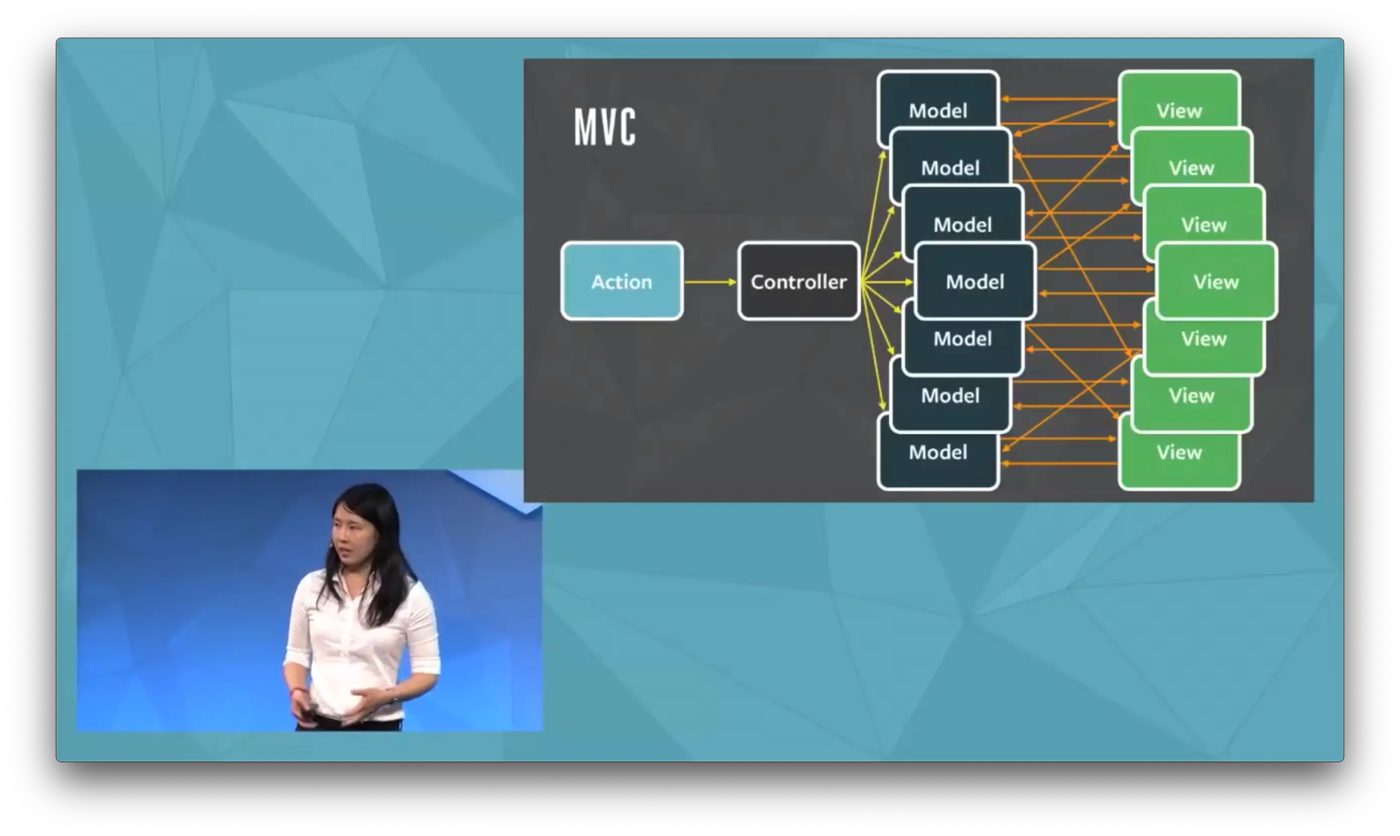整个宣讲 Flux 过程中最令人诟病的就是这一张图,在我上面提到的批评声音中,最共同的声音就是它们以一种错误的方式实施了 MVC,所以才导致了他们的应用无法拓展。时候演讲者 Jing Chen 也承认演示中的图片确实投机取巧了。它们真正想表达的是这种双向的数据流架构会产生一定的负面效应。