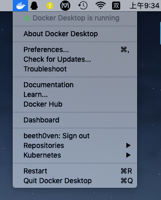 打开 Docker Desktop 应用并授权,稍等 1-2 分钟,状态栏会显示 Docker 图标,点击后可看到: