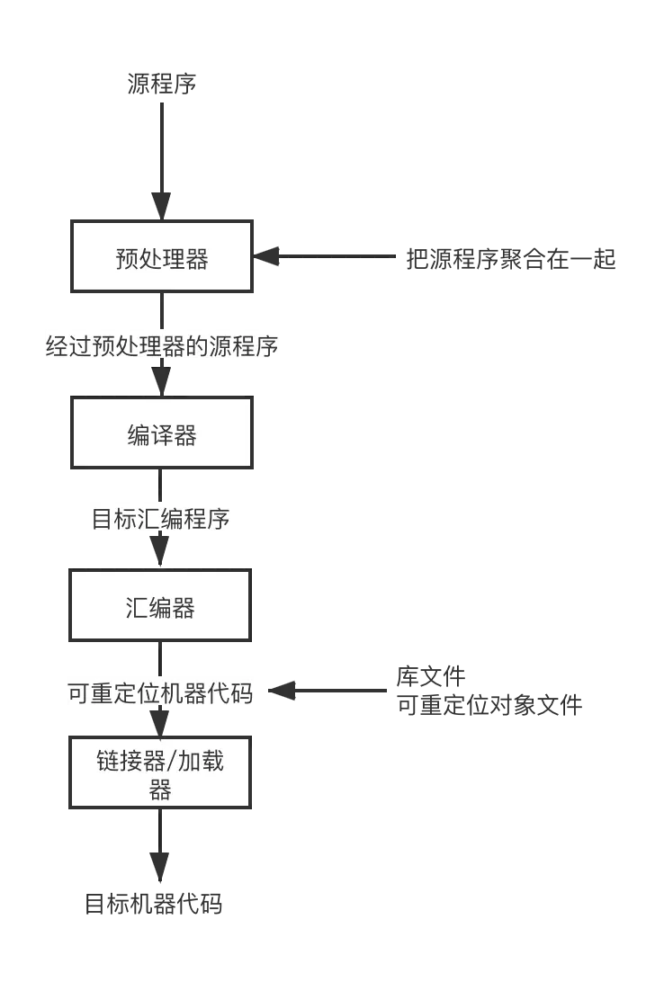 计算机只能识别机器码0101...编程语言->能执行的机器码 需要经过 预处理->编译->汇编->链接->机器码过程。一个语言处理系统的示意图如下: