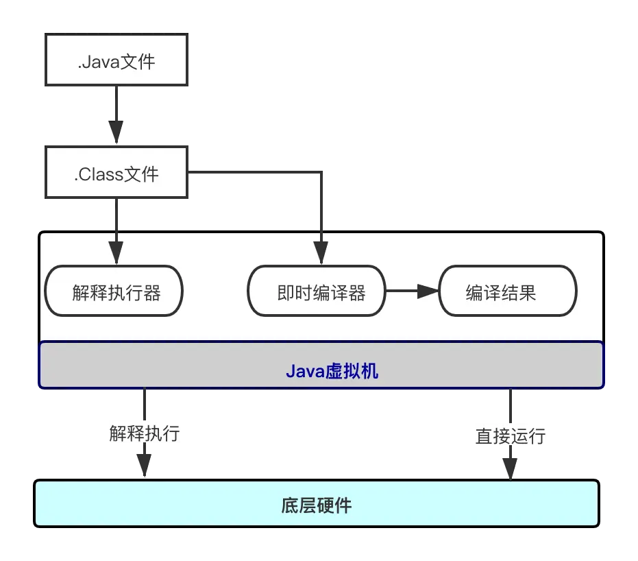 1.解释执行 即逐条将字节码翻译成机器码并执行。