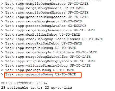 - 执行阶段:就是按顺序执行配置阶段完成的有向无环图中的task。一个新建的APP,点击安装时他的构建过程如下
