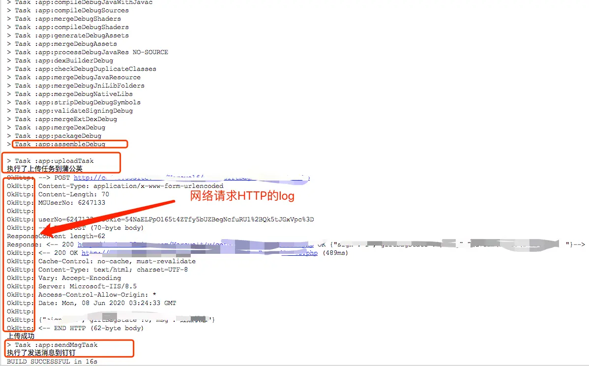 其实就是在自定插件的apply方法中通过create创建一个extension,注意这里的“test”就是在build.gradle中添加这个extension的名字。好了到此准备工作就做完了。那么回到题目所述问题,打包完成之后,先上传到蒲公英,后发消息到钉钉。这里就涉及到几个问题