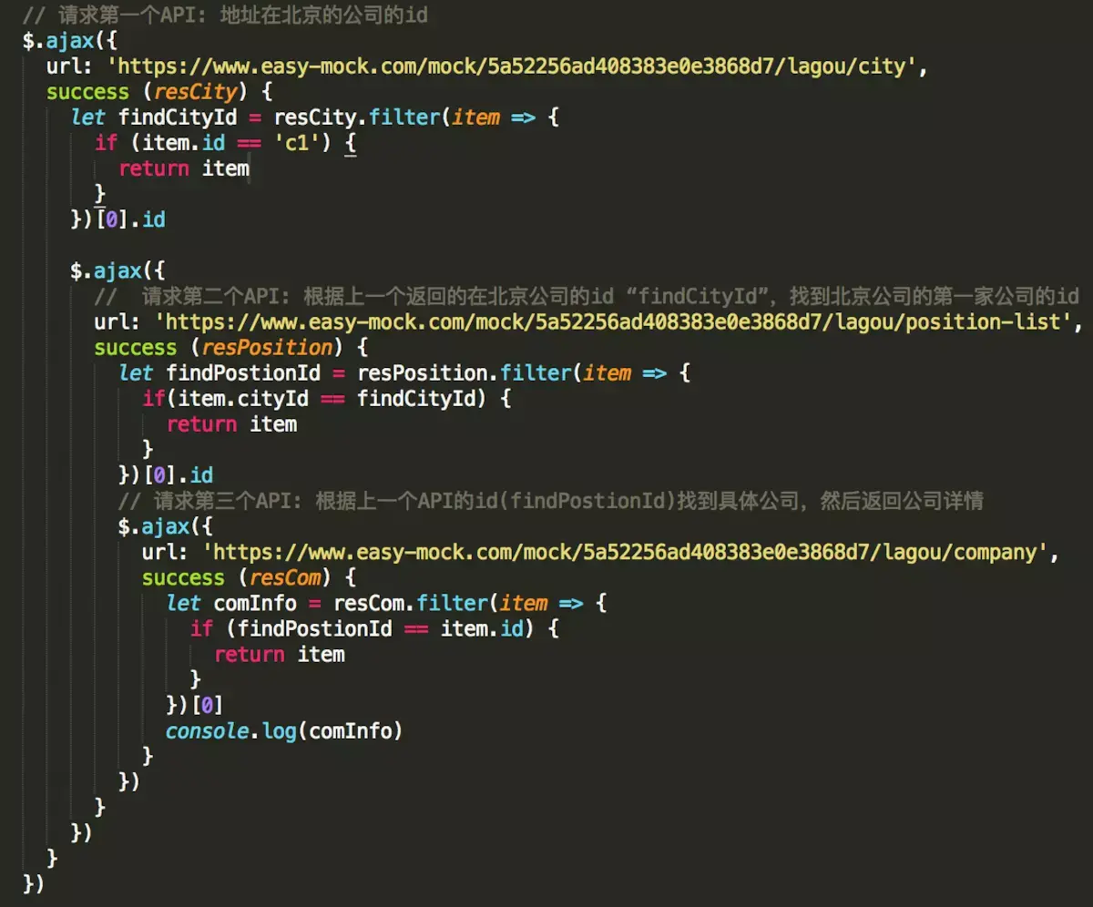 有些情况需要多次调用服务器API,就会形成一个链式调用,比如为了完成一个功能,我们需要调用API1、API2、API3,依次按照顺序进行调用,这个时候就会出现回调地狱的问题
