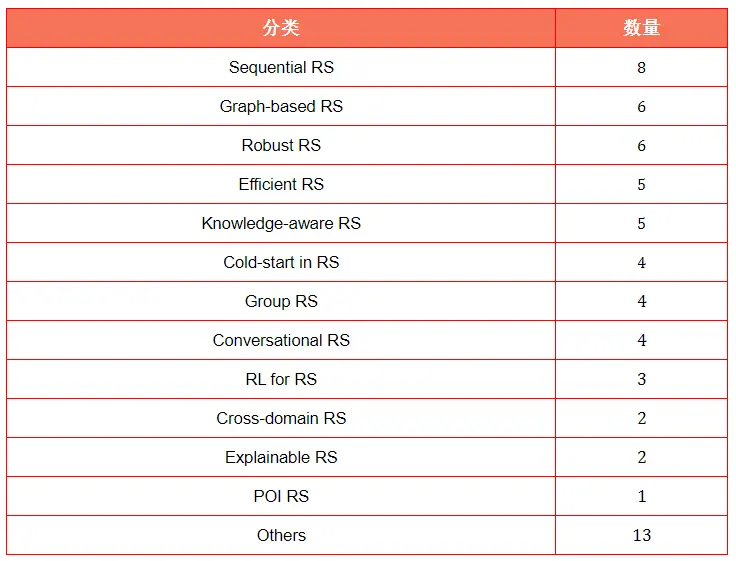 可见,序列化推荐的文章占比较大;随后是基于图的推荐、鲁棒的推荐系统;其次是提升推荐效率的文章、基于知识的推荐以及解决冷启动问题的推荐文章、组推荐、对话推荐系统;最后是强化学习推荐、跨域推荐、可解释推荐以及兴趣点推荐。当然其他类别中包含了许多有意思的研究,比如消除推荐偏置(Bias)的文章、分布式训练推荐系统的文章等。
