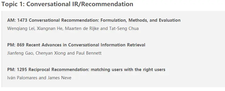另外,还注意到今年SIGIR开办了一场关于对话推荐/检索的Tutorial,感兴趣的小伙伴可以多多关注。想提前了解对话推荐(Conversational RS,CRS)的朋友,可以公众号后台回复【CRS】获取对话推荐系统最新综述。