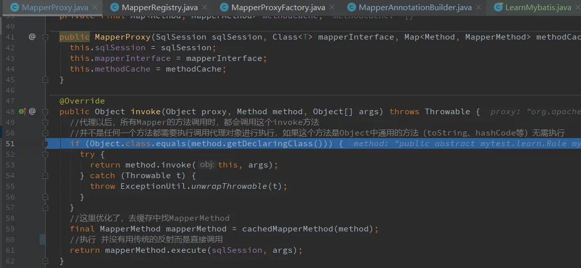 这次学习mybatis源码,总的来说比较简单,我们可以对比出来,使用JDBC 和 Mybatis的区别。也学了很多,特别是反射,工厂,代理,装饰者。这些都是设计模式啊,日常都会涉及到,但是叫你使用起来也是有难度的。个人看法,对于Mybatis这种框架,只需要把核心流程理解了就可以了,如果要你开发Mybatis框架的话,那再进行深入探究。