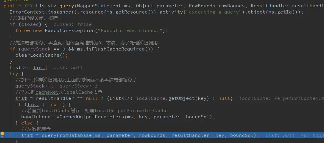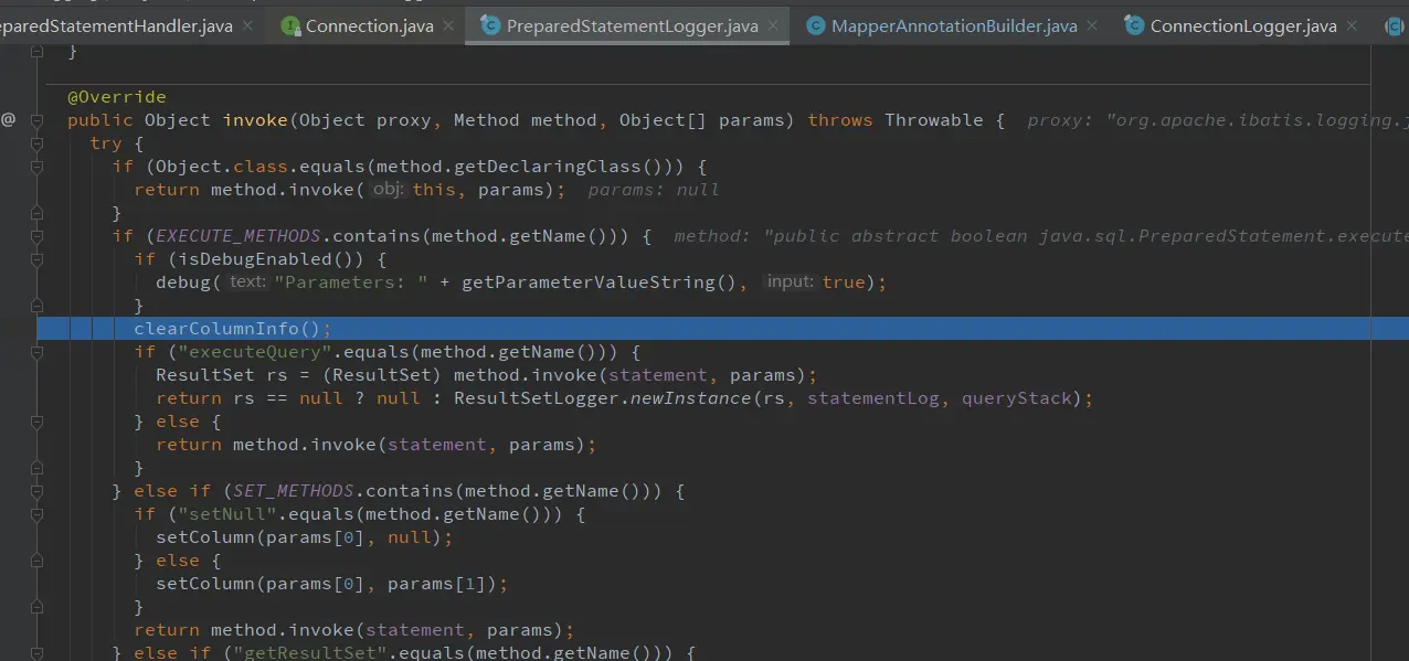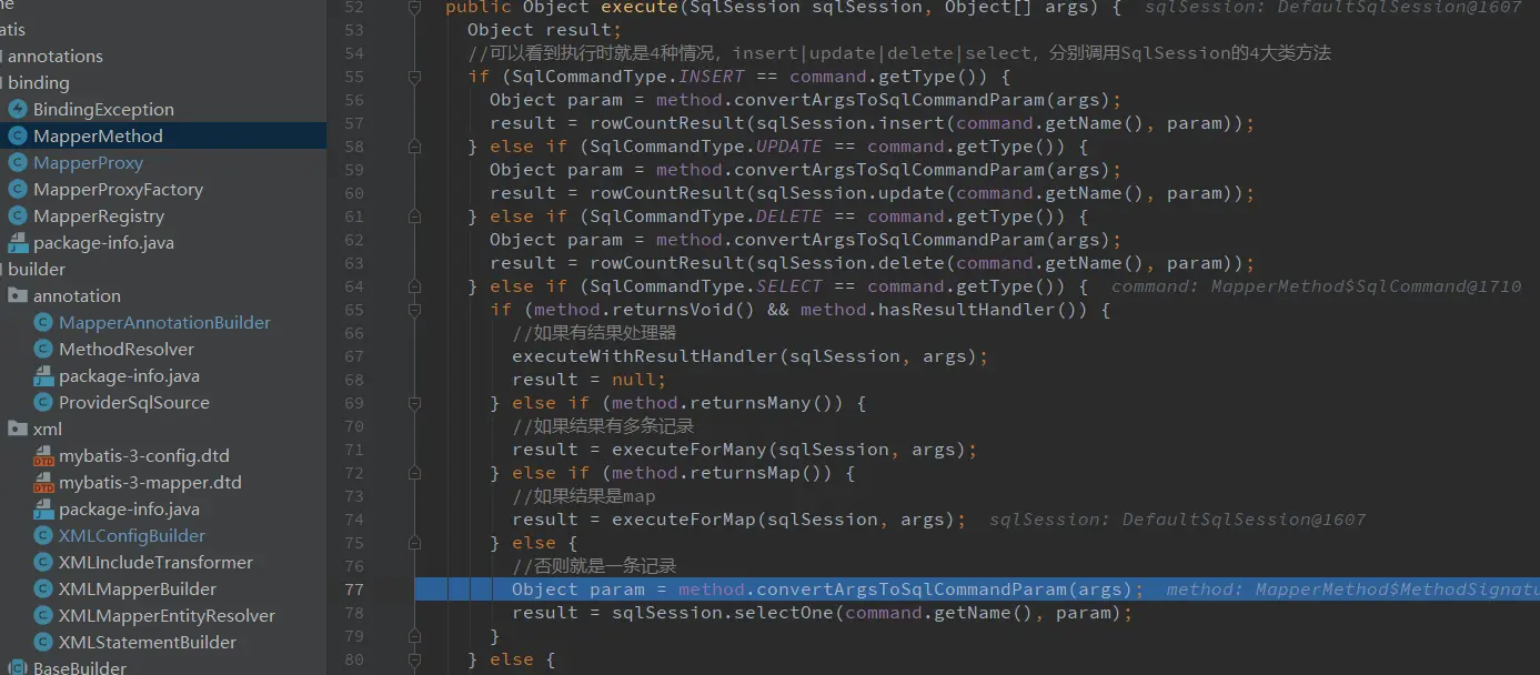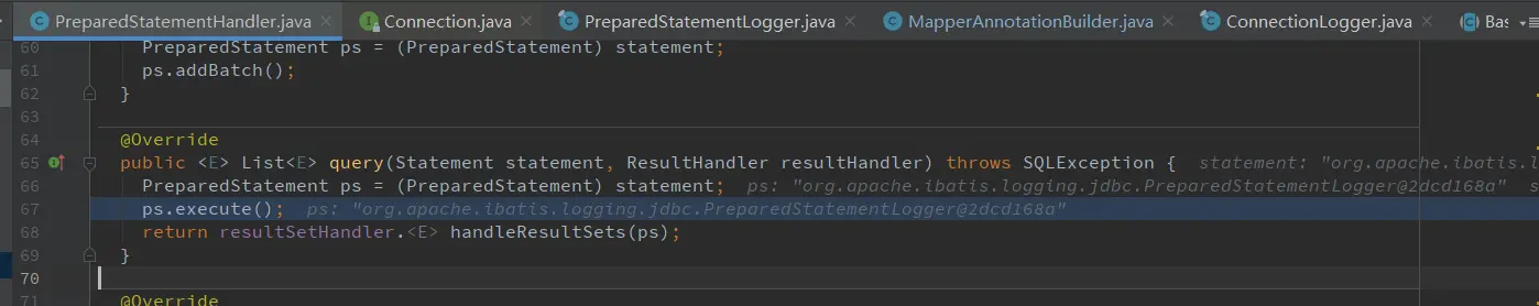 excute方法,由于PreparedStatement对象被代理了,所以走到PreparedStatementLogger类 由于使用了反射,Idea无法进入具体相关实现类,statement对象是com.mysql.cj.jdbc.ClientPreparedStatement,method是java.sql.PreparedStatement#execute也就是statement对象的execute方法。这里得到数据库的数据。 7.获取到数据之后,包装成返回类型的对象。
