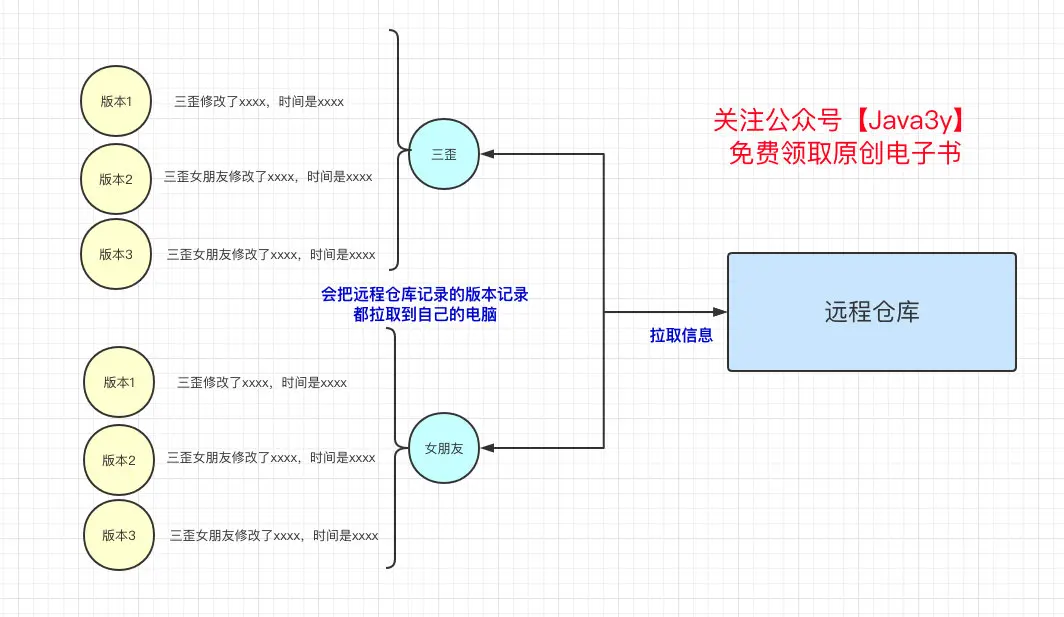 三歪:“是这样的,我们从远程仓库拉取代码的时候除了会把有变动的代码同步到自己的电脑上,还会把所有修改的记录也同步到自己的电脑上。所以说,我们会知道彼此修改的内容。”