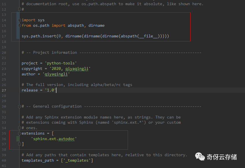 所以呢,我们要让 conf.py 找到代码,那么就要添加好路径,在最开头修改,如下: