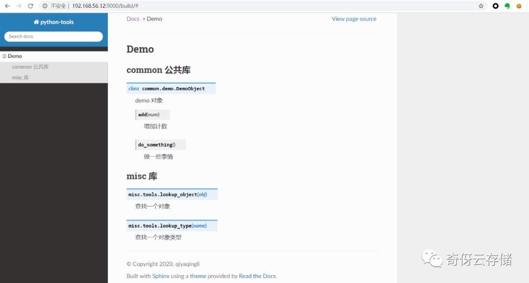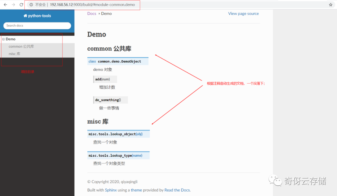解释下,这里的 common.demo 和 misc.tools 模块对应了 py 文件。这个怎么才能找到这两个模块,这个就跟你配置 conf.py 里面的 path 配置有关。