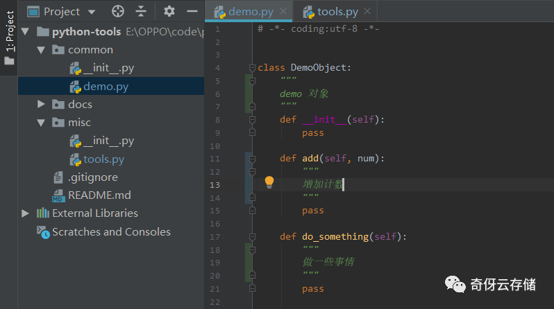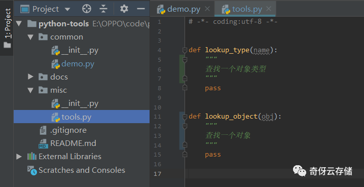 搞了一个最简单的示例,项目根目录是 ~/qiya/python-tools/ ,下面都是以此目录为基础,下面的是我自己创建的目录,搞了几个简单的目录,common, misc 是项目的代码目录,docs 是我预定的专门放文档的目录。