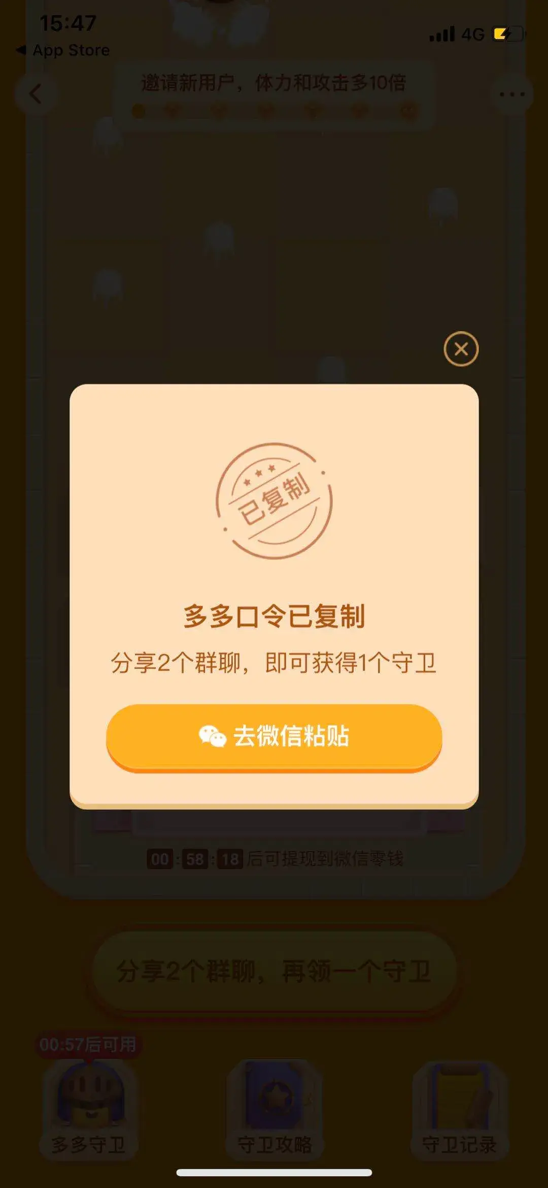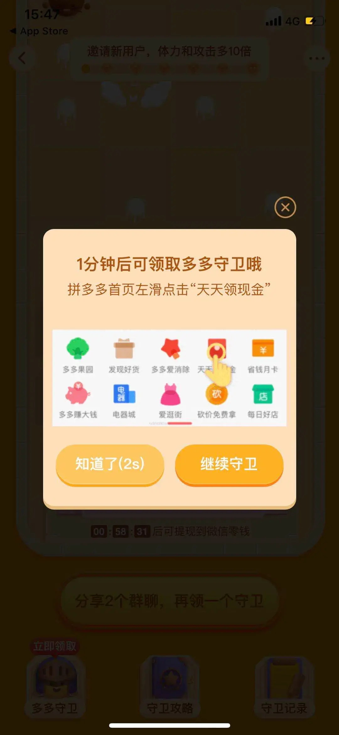 福袋和游戏守卫玩法,通过邀请好友,增加奖励金和守卫数量来提升自我奖励。在拼多多里面,内部有以优惠、领现金为主导的拉新玩法。