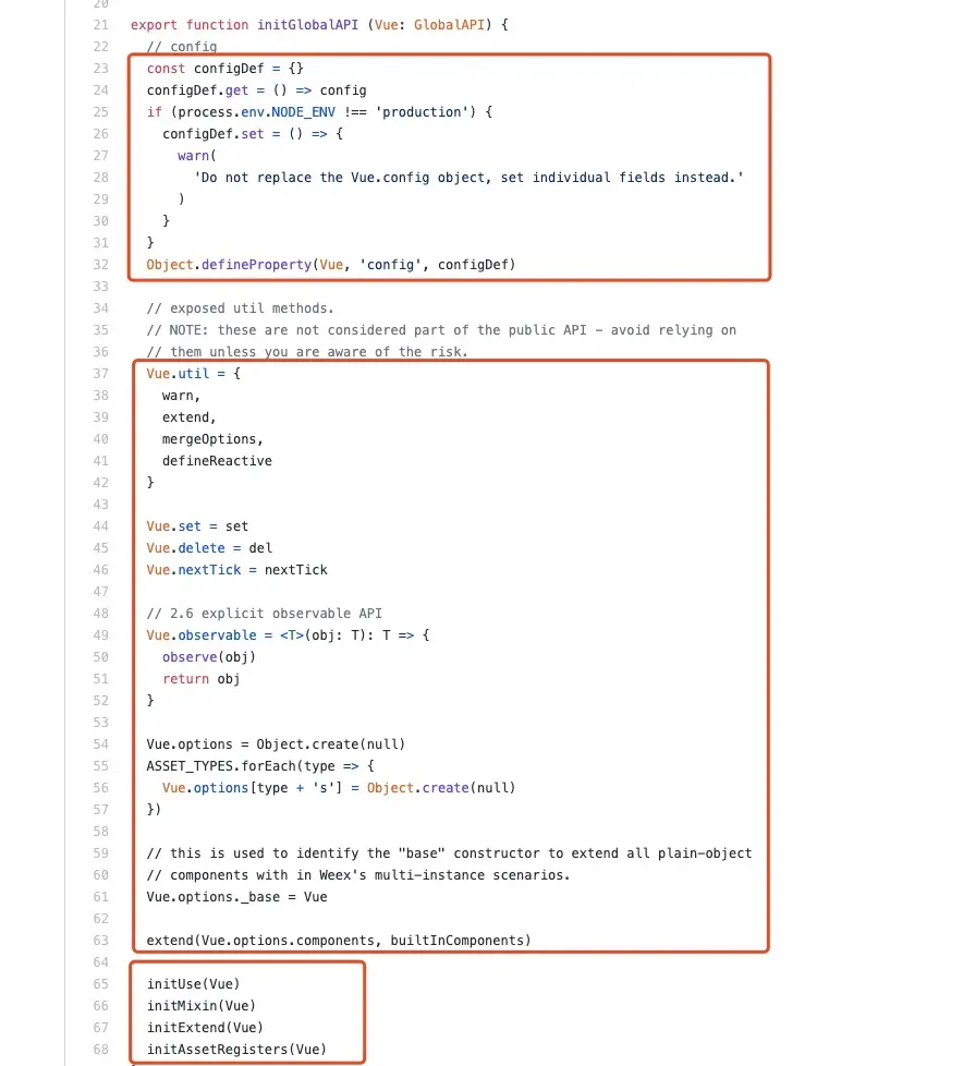 Vue函数属性初始化逻辑都在initGlobalAPI函数中,下面是该函数初始化的逻辑。