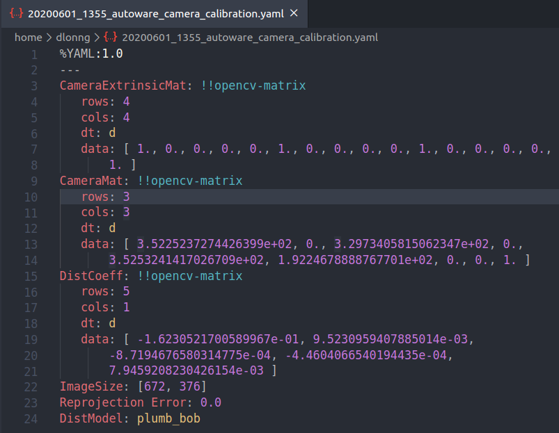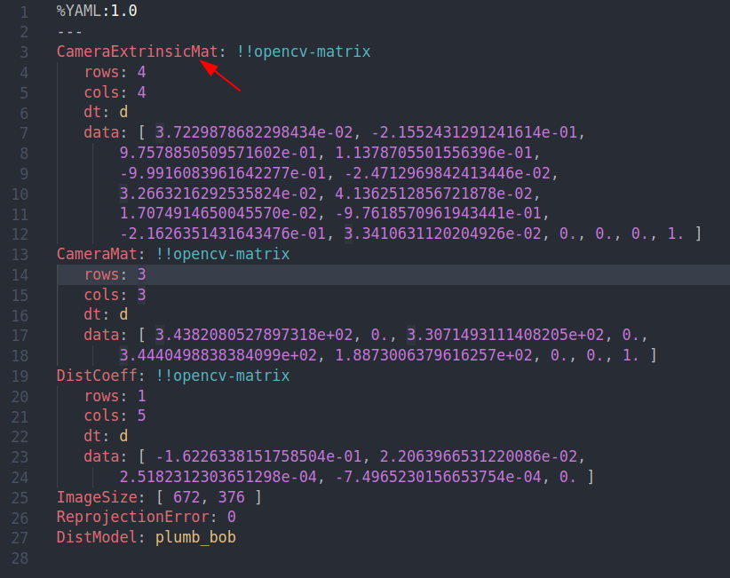 最终的标定文件保存在 home 目录下,以下是外参文件内容,第一个就是 4x4 的外参矩阵:
