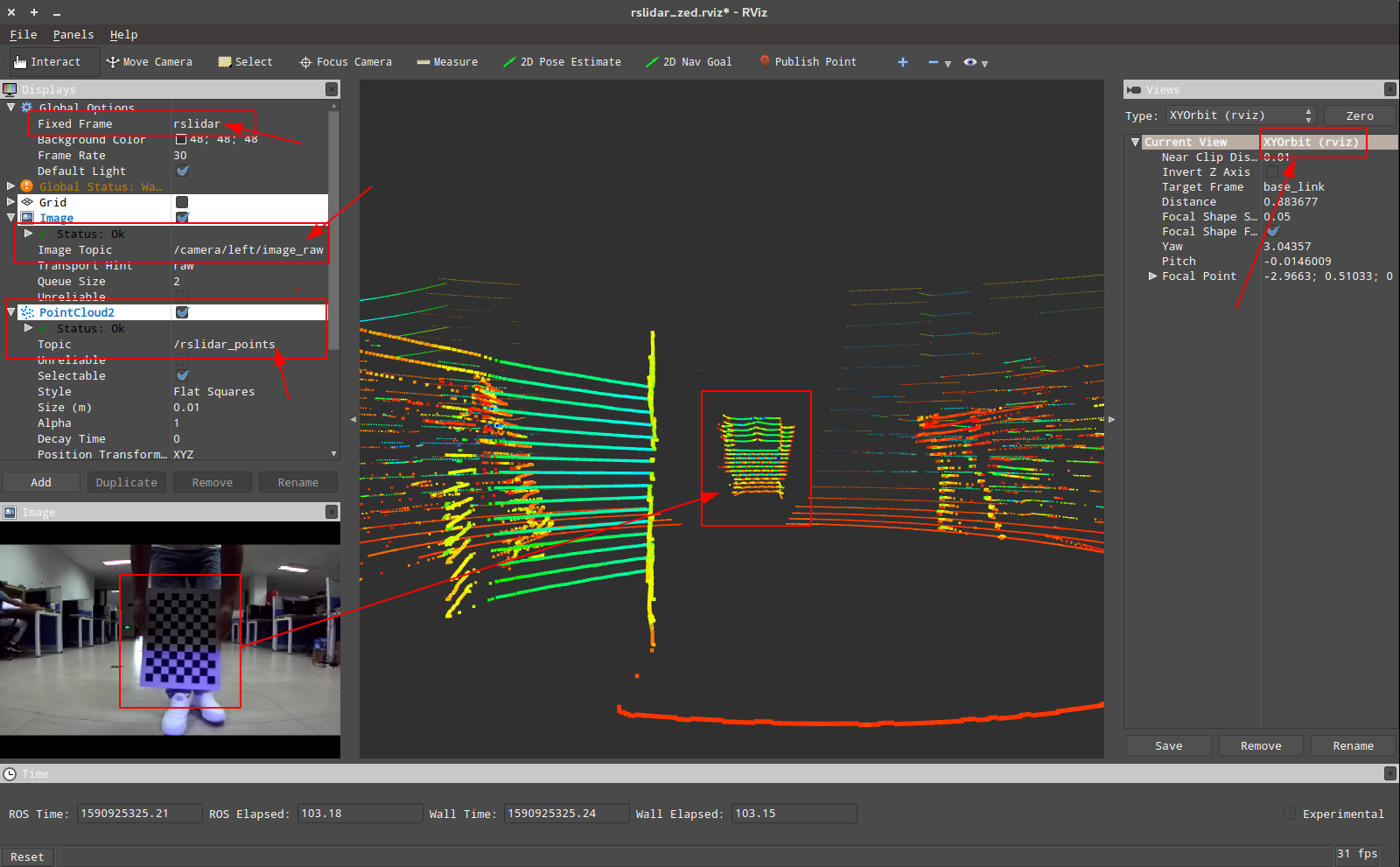 分别设置每个订阅话题的 topic、FixedFrame 设置为 rslidar 不然会没有点云显示、切换点云查看视角,用鼠标滑轮调整点云距离,确保能看到我这样的标定板: