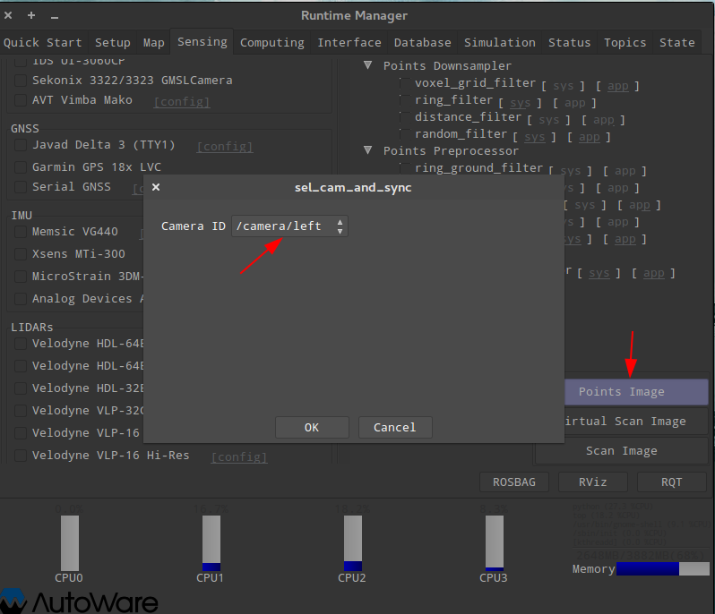 点击 OK 关闭窗口(查看终端是否会输出红色错误信息,一般不会),然后再点击 Points Image 选择相机 ID 为 left,点击 OK 确定(此时终端再输出一些信息,但不会报红色错误),如果你的终端出现红色错误信息,就要查看配置是否正确了:
