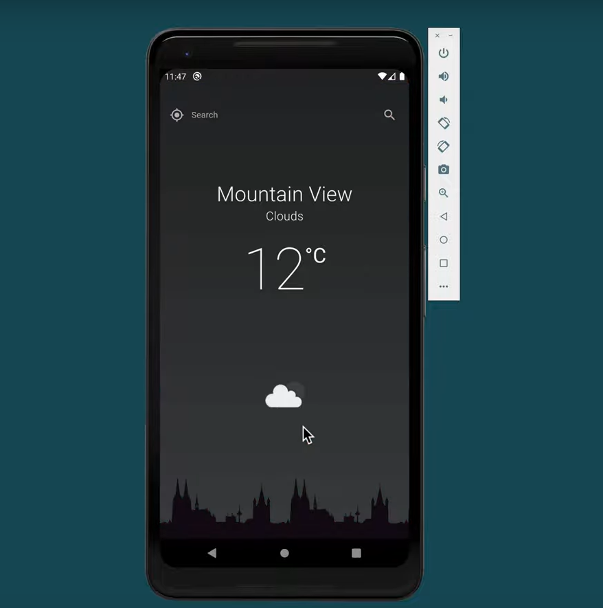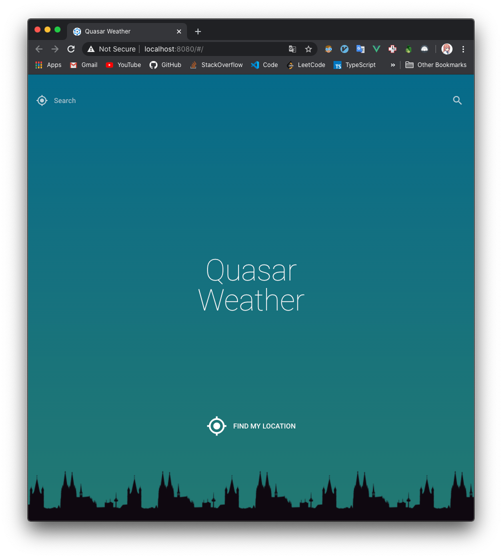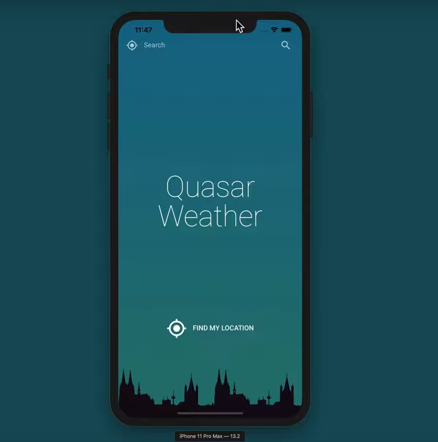 至此,我们实现了搜索栏(样子货),实现了当有天气数据时显示天气(此时为假数据)和对应的图片(尚未添加),没有天气数据的时候显示应用 logo 并显示定位按钮,最底部还有城市的 illustration 来做装饰。
