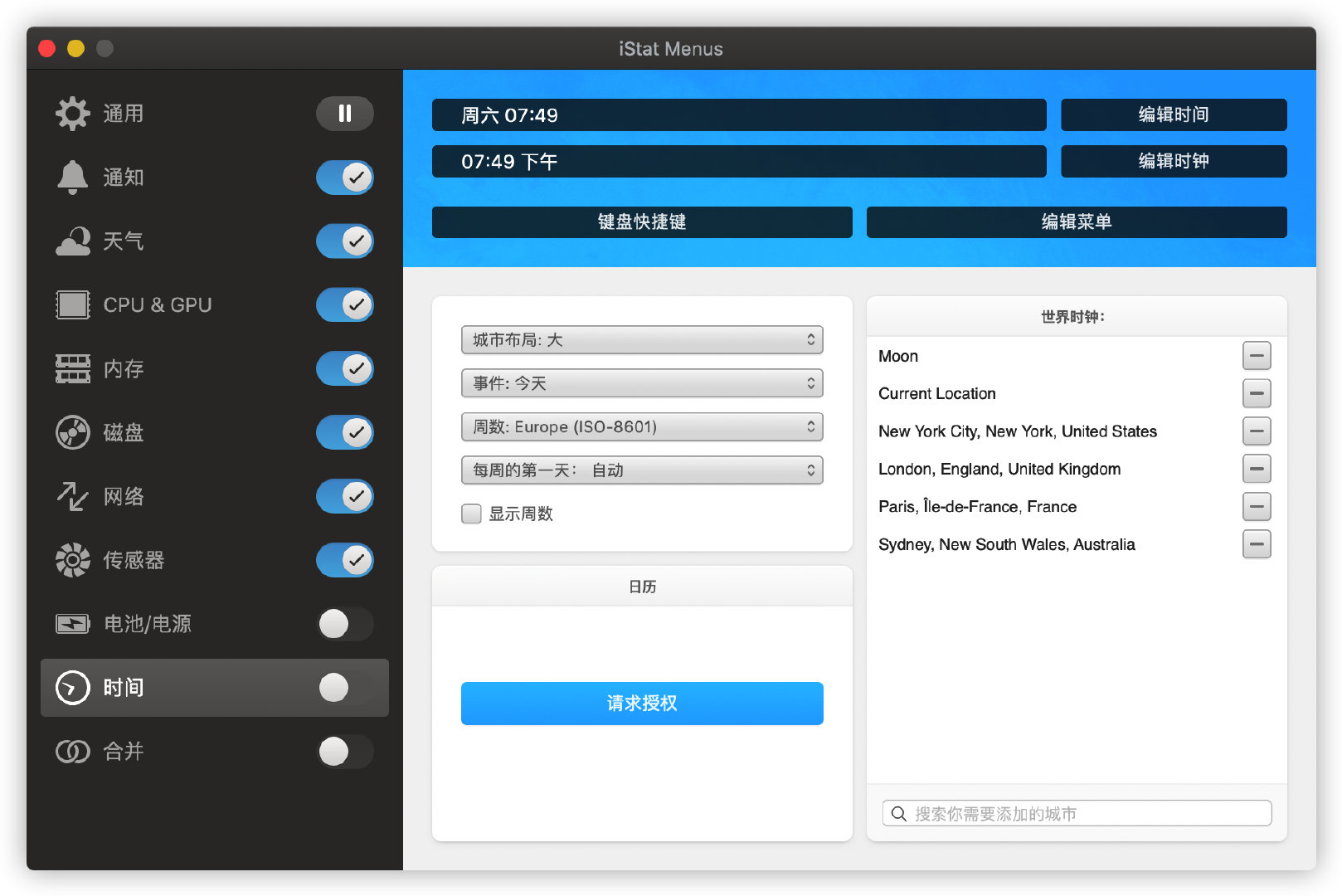 高度可定制的菜单栏时钟,日历与即将举行的活动,世界时钟与详细的太阳和月亮信息。