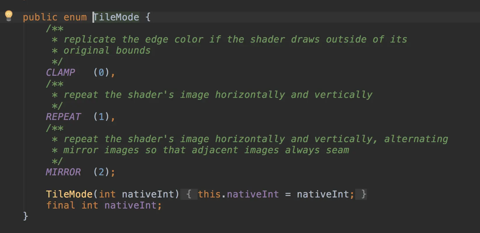 是一个枚举类有三个值,CLAMP,REPEAT,MIRROR并都有做解释。我的理解是: