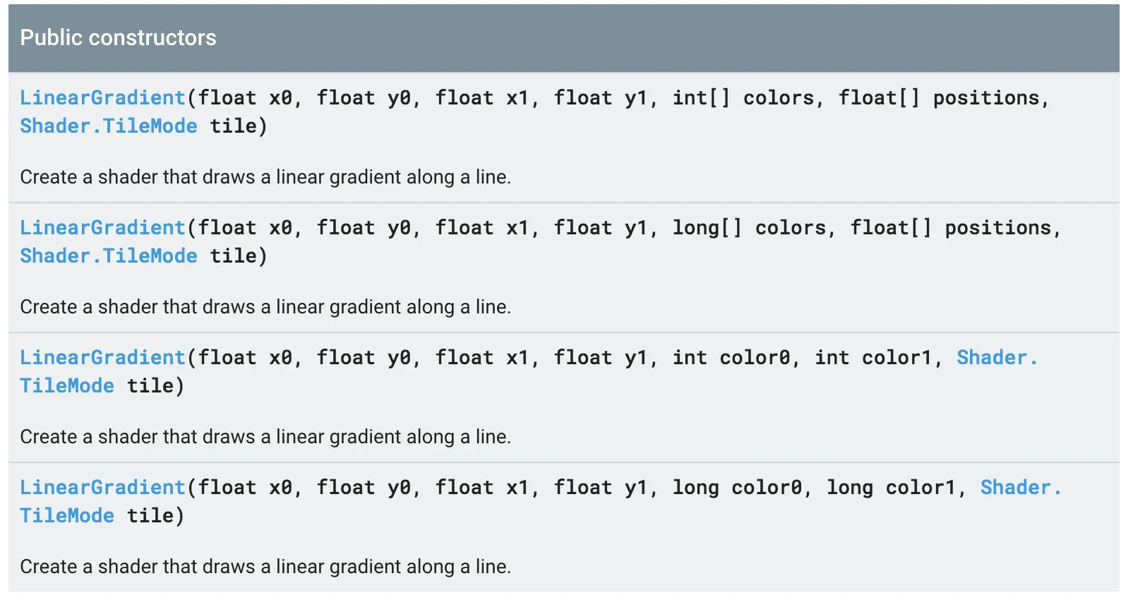 显而易见可以将1,2行归为第a类,3,4行归为第b类。两类构造函数,前四个参数都一致float类型,表示起始坐标x、y,结束坐标x,y。最后一个也即拉伸模式,上文已作介绍,不再赘述。不同的是第5,6两位参数,b是两个int/long型color,color1这表示的是渐变的起始颜色和结束颜色;a是两个数组分别(colors,positions),在我们遇到需指定除起止两处外中间多个位置(相对)渐变色数值时可用到。这里就以复杂点的b实践下。