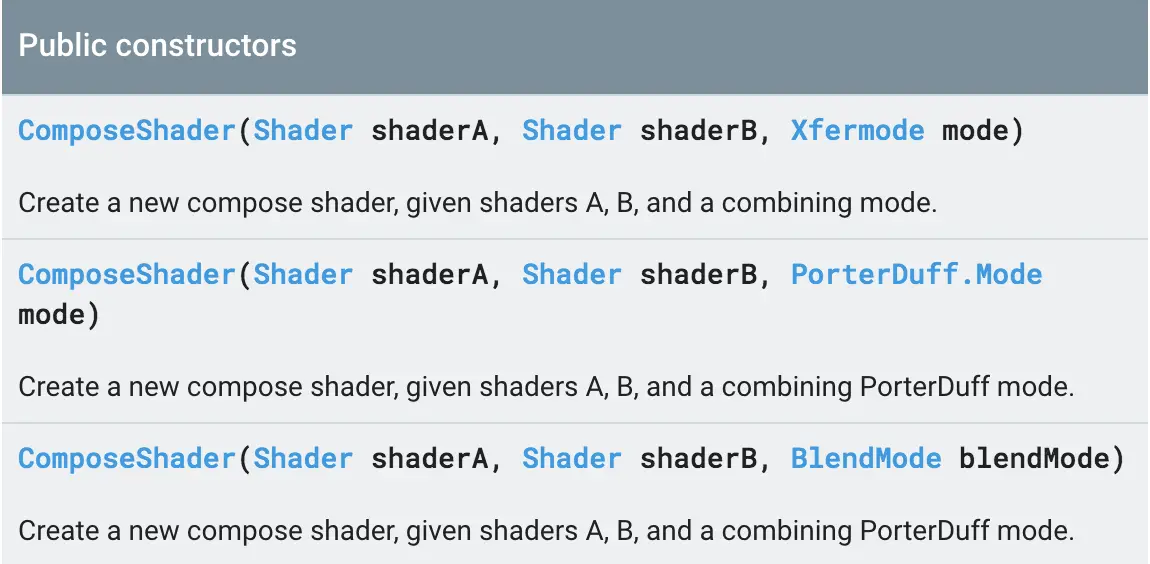 构造函数第一二个参数为两个shader,组合着色器的用途即,将shaderA,shaderB两个shader以指定的模式组合起来。(注:指定模式有Xfermode,PorterDuff.Mode及api29加入的BlendMode等。之后会有专门的文章来介绍Xfermode的使用。可以理解为两个shader组合起来的方式,这里就不具体一一介绍。)