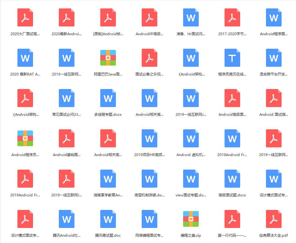 为了帮助大家提升进阶,3个月实现快速突破!我分享一份由几位大佬一起收录整理的Android学习PDF+架构视频+面试文档+源码笔记,还有高级架构技术进阶脑图、Android开发面试专题资料,高级进阶架构资料供大家学习进阶
