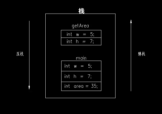 4)方法压栈执行并为形参赋值 int w=5;int h=7; 计算结果并return 35;将结果返回方法的给调用者