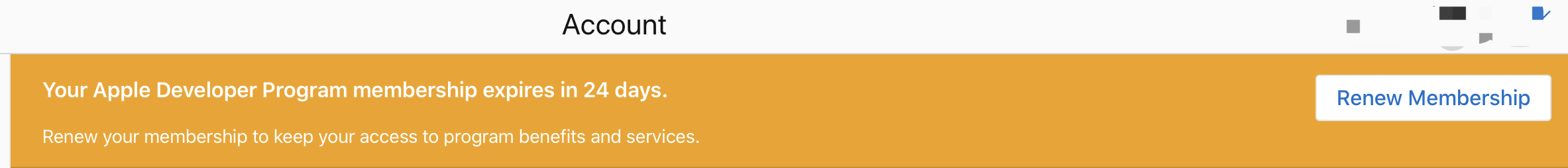 2020年之前开发者账号需要续费,直接登录登录developer.apple.com网站在顶部显示下图,点击'Renew Membership',按步骤续费就可以了