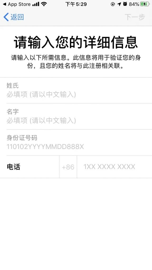 - 输入您的名字、姓氏、身份证号和电话号码。请勿输入别名、昵称或公司名称作为您的姓氏或名字,错误地输入您的法定姓名将导致注册审核延误。