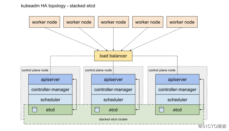 Kubernetes的高可用主要指的是控制平面的高可用,简单说就是有多套Master节点组件和Etcd组件,工作节点通过负载均衡连接到各Master。